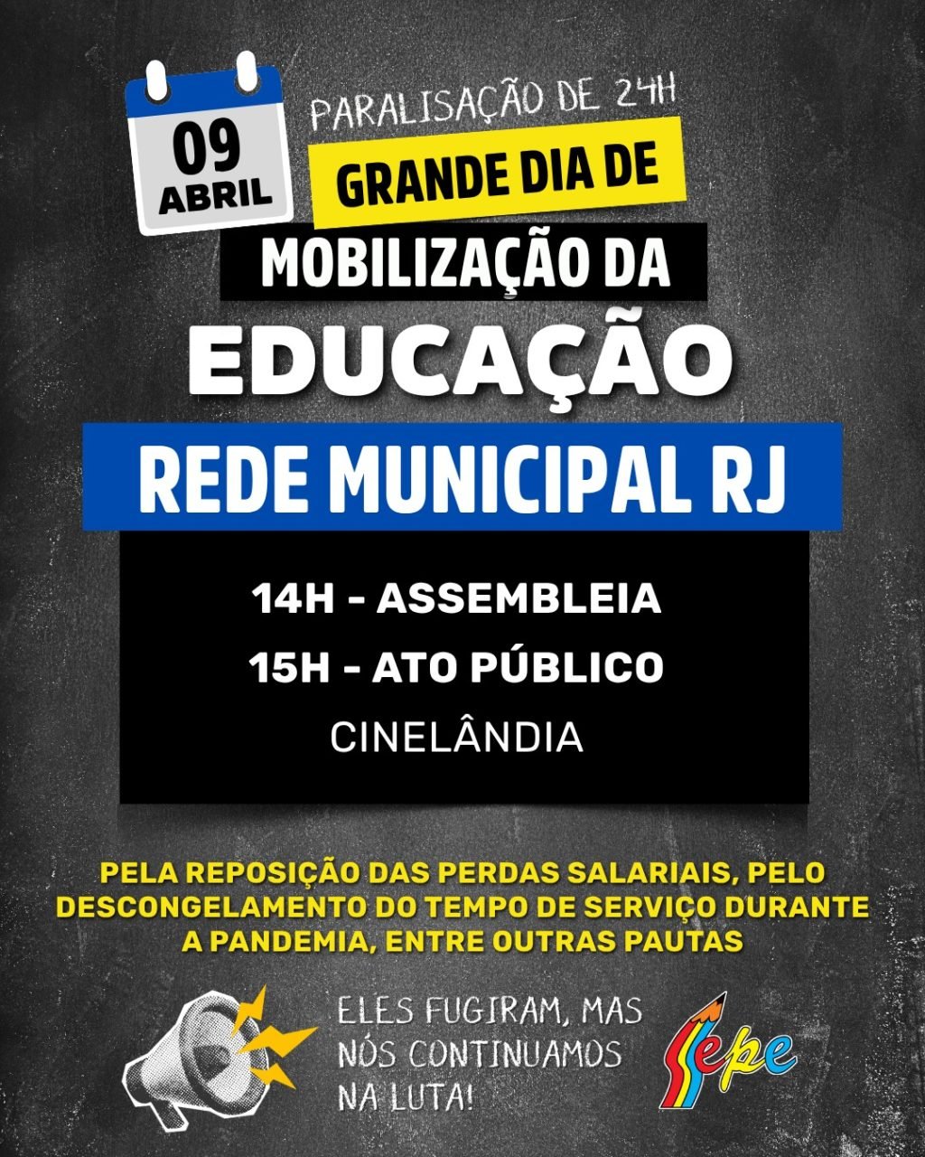Os profissionais de educação da rede municipal do Rio de Janeiro vão paralisar as atividades por 24 horas, nesta quinta-feira, dia 9 de abril. Neste dia, a categoria fará uma assembleia/Ato (agitativa) na Cinelândia, às 14h, com ato às 15h. A categoria reivindica reajuste salarial e uma extensa pauta de reivindicações pedagógicas, além da abertura de negociações com a prefeitura — Paes, em seus quase oito anos de gestão, nunca recebeu o Sepe.No mesmo dia 9, a rede estadual também irá paralisar as atividades, com assembleia às 10h, no ClubeSEE DETAILS