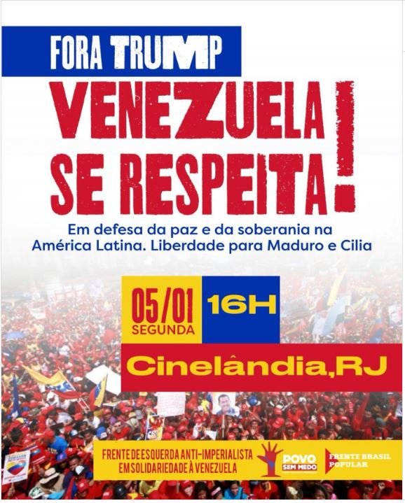 Com respeito ao ataque americano contra a Venezuela na madrugada do dia 03 de janeiro, que resultou no sequestro do presidente Nicolas Maduro e sua esposa Cilia Flores e na morte de mais de 80 pessoas, as Frentes Povo sem Medo, Brasil Popular e Frete de Esquerda Anti-imperialista em Solidariedade à Venezuela e outras entidades do movimento social convocam para um ato que será realizado nesta segunda-feira, dia 05 de janeiro, a partir das 16h, na Cinelândia em solidariedade ao povo venezuelano e pela libertação do presidente deste país e sua companheira.
