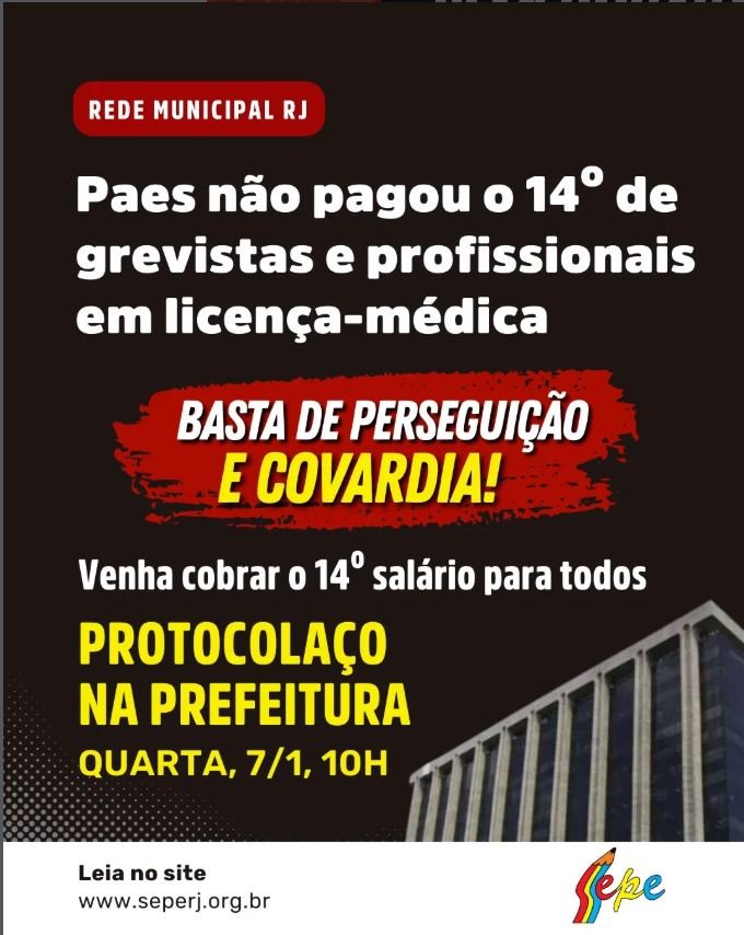 O Departamento Jurídico (DJ) do Sepe já está preparando um ofício solicitando uma audiência com o governo municipal para deixar clara a nossa posição contra tal tipo de política punitiva e excludente contra os profissionais das escolas municipais que lutam, assim como para com os que se encontram de licença médica e os aposentados.