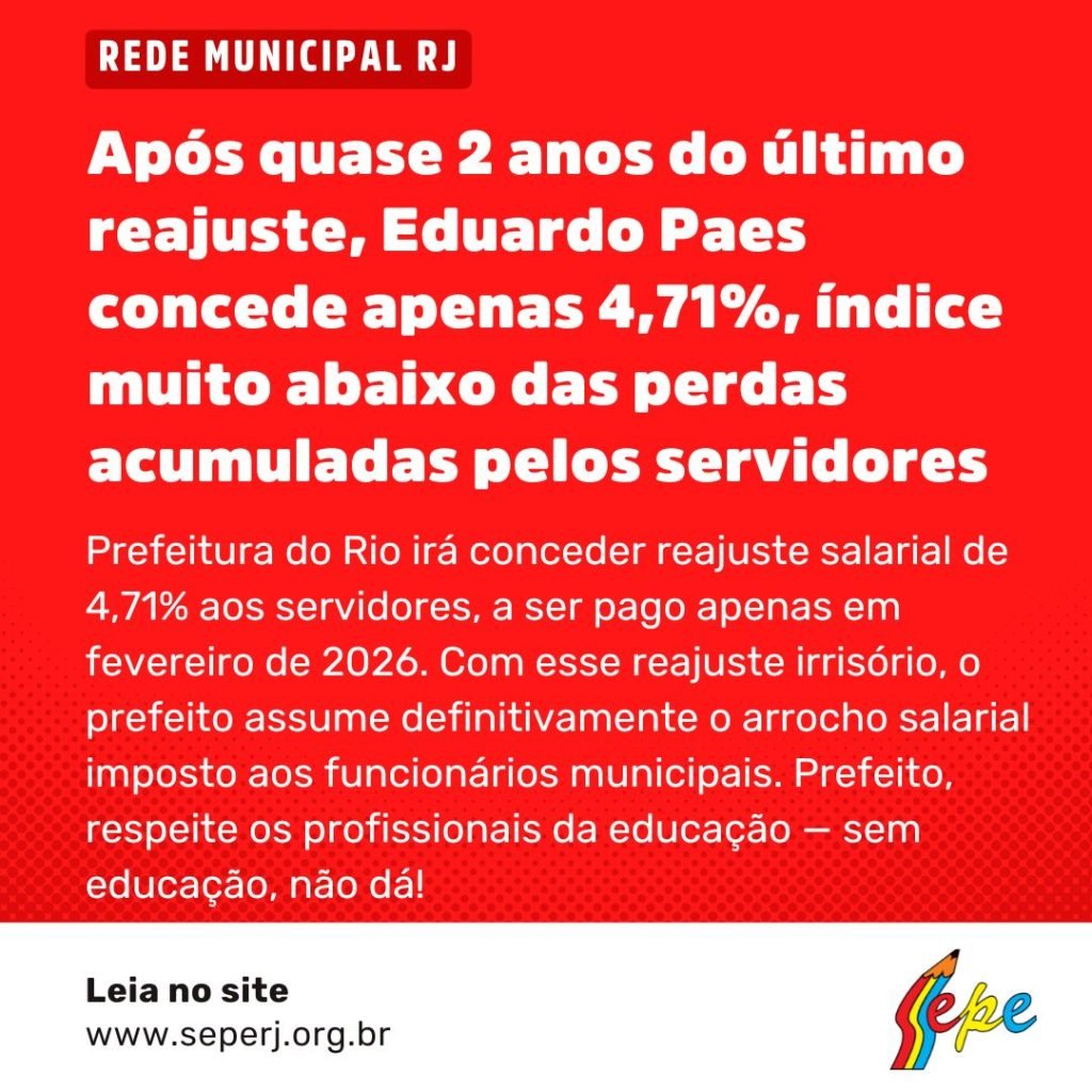 Ou seja, com esse reajuste irrisório, o prefeito assume definitivamente o arrocho salarial imposto ao servidor municipal do Rio de Janeiro.