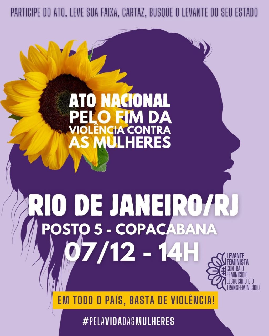 No dia 07 de dezembro, será realizado o Ato Nacional Pelo Fim da Violência Contra as Mulheres. O protesto será realizado no calçadão da Avenida Atlântica, na altura do posto cinco, com concentração marcada para as 14h. O ato terá abrangência nacional e, no Rio de Janeiro, a Praia de Copacabana foi escolhida como palanque para que os movimentos sociais e a sociedade civil organizada possam erguer a sua voz e exigir o fim da violência de gênero, que se traduz num número absurdo de agressões e feminicídios espalhados por todas as cidades brasileiras.
