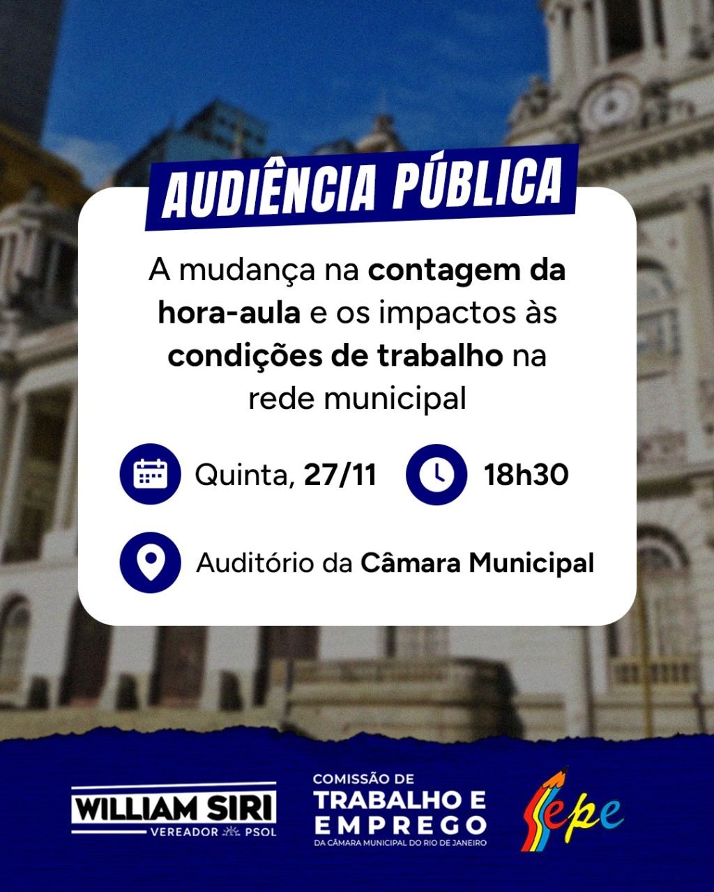 A Comissão de Trabalho e Emprego da Câmara Municipal do Rio convida para a audiência pública que será realizada no dia 27 de novembro, a partir das 18h30 e que terá como tema da discussão a “Mudança na contagem da hora-aula e os impactos para as condições de trabalho na rede municipal do Rio de Janeiro”. O evento acontecerá no auditório do Palácio Pedro Ernesto.