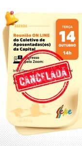A Secretaria de Aposentados do Sepe RJ comunica o cancelamento da reunião do Coletivo de Lideranças da Capital, que seria realizada nesta terça-feira, dia 14 de outubro. A reunião foi cancelada em virtude da participação dos aposentados no ato público contra o PL 6035/2025, que ataca o caixa do Rioprevidência e autoriza o governador Cláudio Castro a utilizar o dinheiro dos royalties do órgão, fundamental para a manutenção das nossas aposentadorias e pensões.