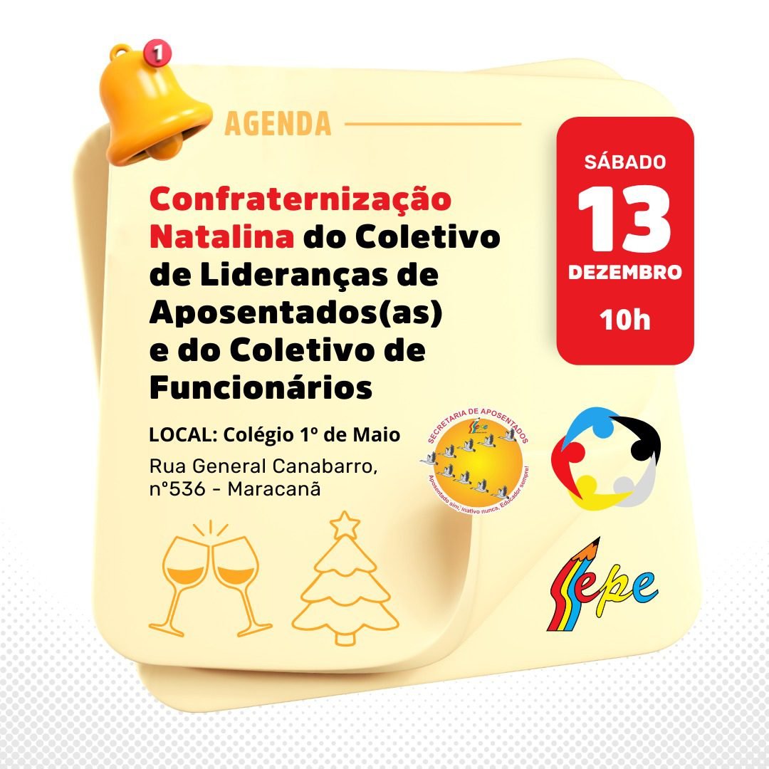 As Secretarias de Aposentados e de Funcionários do Sepe RJ convidam para a confraternização natalina do Coletivo de Lideranças de Aposentados e do Coletivo de Funcionários, que será realizado no dia 13 de dezembro (sábado), no Colégio 1º de Maio (Rua General Canabarro, 536 – Maracanã), a partir das 10h.