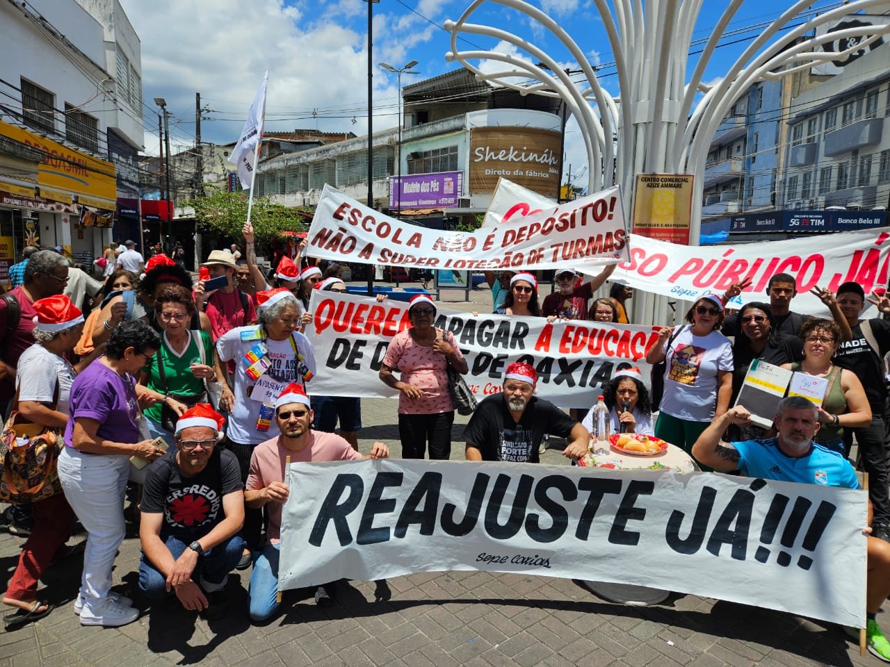 No dia 26 de novembro, os profissionais de Educação de Duque de Caxias protestaram contra os 10 anos sem reajuste salarial na rede com paralisação e ato público, que incluiu a realização de uma ceia da miséria para denunciar o sofrimento causa pela falta de reajuste para a categoria.