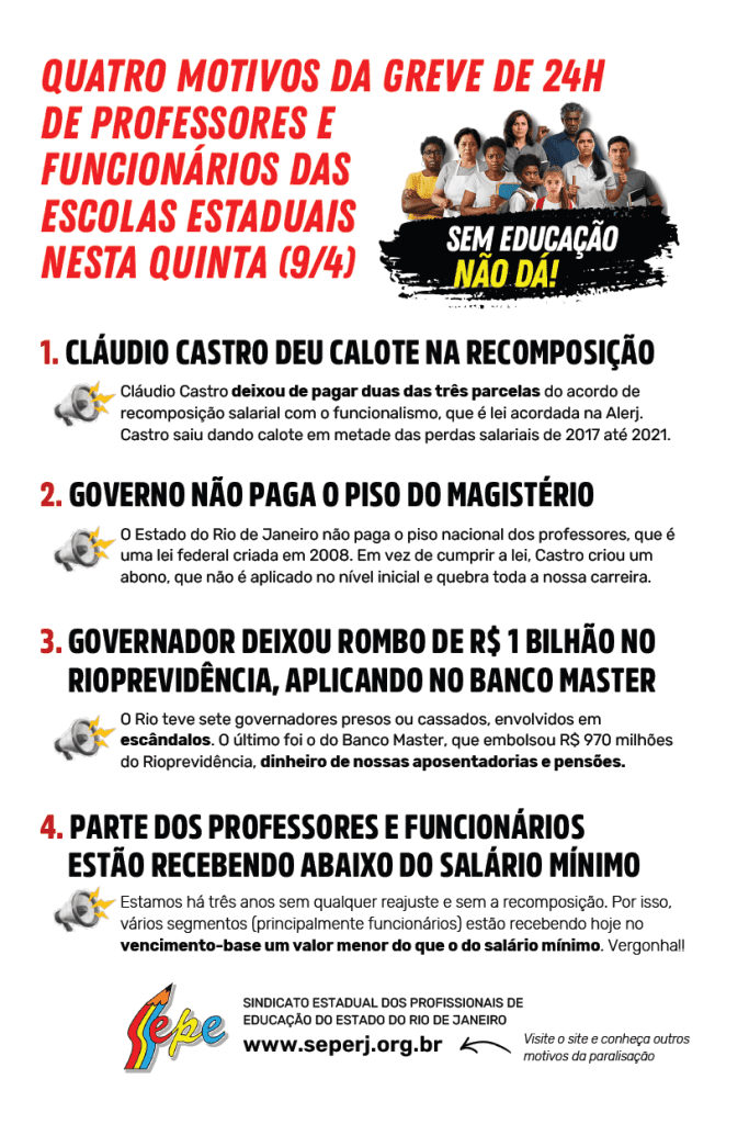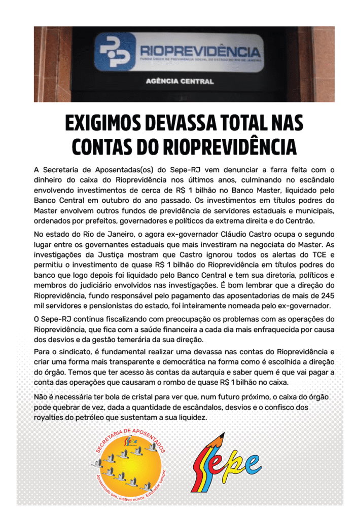 O Sepe produziu dois panfletos para a população, apresentando denúncias e reivindicações de aposentados e profissionais da educação da rede estadual.