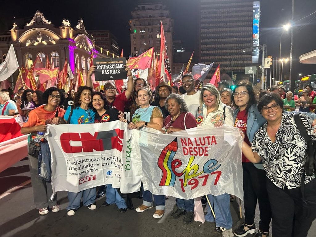 Os profissionais que integram a delegação do Sepe RJ na 1ª Conferência Internacional Antifascista Pela Soberania dos Povos, que se iniciou ontem, dia 26 de março, em Porto Alegre (RS), participaram da marcha de abertura realizada no centro da capital gaúcha. O Sepe enviou uma delegação de 70 pessoas para participar das discussões e da formulação de estratégias para conter o avanço das forças fascistas e da extrema-direita ao nível mundial, apoiadas por grande parte importante do capital financeiro internacional.