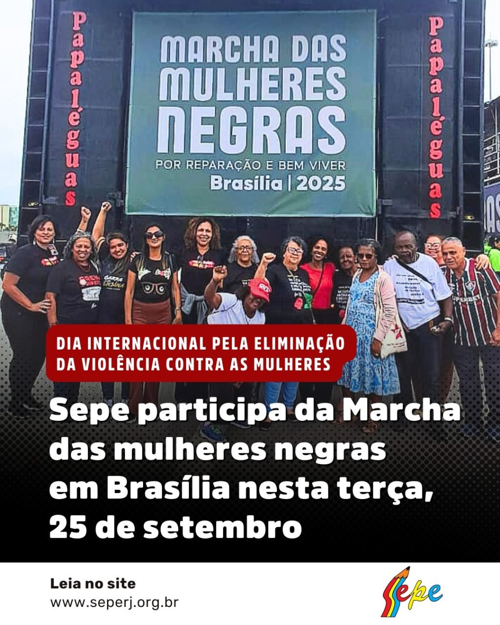 Ainda dentro das atividades do Dia de luta contra a violência contra as mulheres, o Sepe enviou uma delegação a Brasília para participar da mobilização na capital federal durante o dia de hoje. A organização da Marcha das Mulheres Negras conta com o apoio da CNTE e demais sindicatos e dela participam delegações de vários estados do país. A marcha é iniciativa da Articulação de Organizações de Mulheres Negras Brasileiras (AMNB), da Rede de Mulheres Negras do Nordeste e da Rede Fulanas – Negras da Amazônia Brasileira.