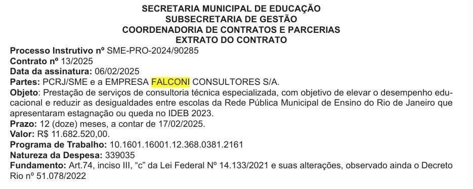 Diário Oficial, relativo à renovação do contrato entre a Falconi e a SMERJ (21/02/2025)