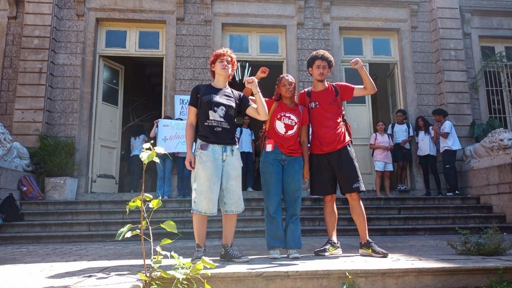 Marissol Lopes, presidente da AMES-RJ, agredida ontem por um PM no interior da escola e outros representantes de entidades do movimento estudantil participaram do ato hoje na porta do CE Amaro Cavalcanti