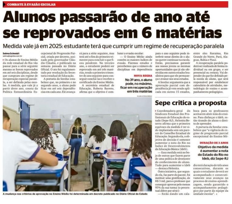 reportagem do Jornal Extra sobre a aprovação automática no Estado com a crítica do Sepe à proposta de Cláudio Castro e Roberta Barreto