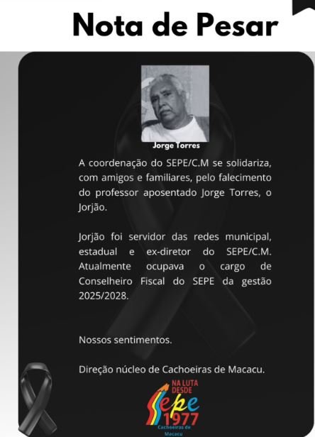 O Sepe RJ comunica com pesar o falecimento do professor aposentado das redes municipal e estadual Jorge Torres, o Jorjão. O profissional também teve uma atuação combativa em nosso sindicato, no núcleo de Cachoeiras de Macacu, e atualmente era um dos conselheiros fiscais da atual gestão 2025-2028.