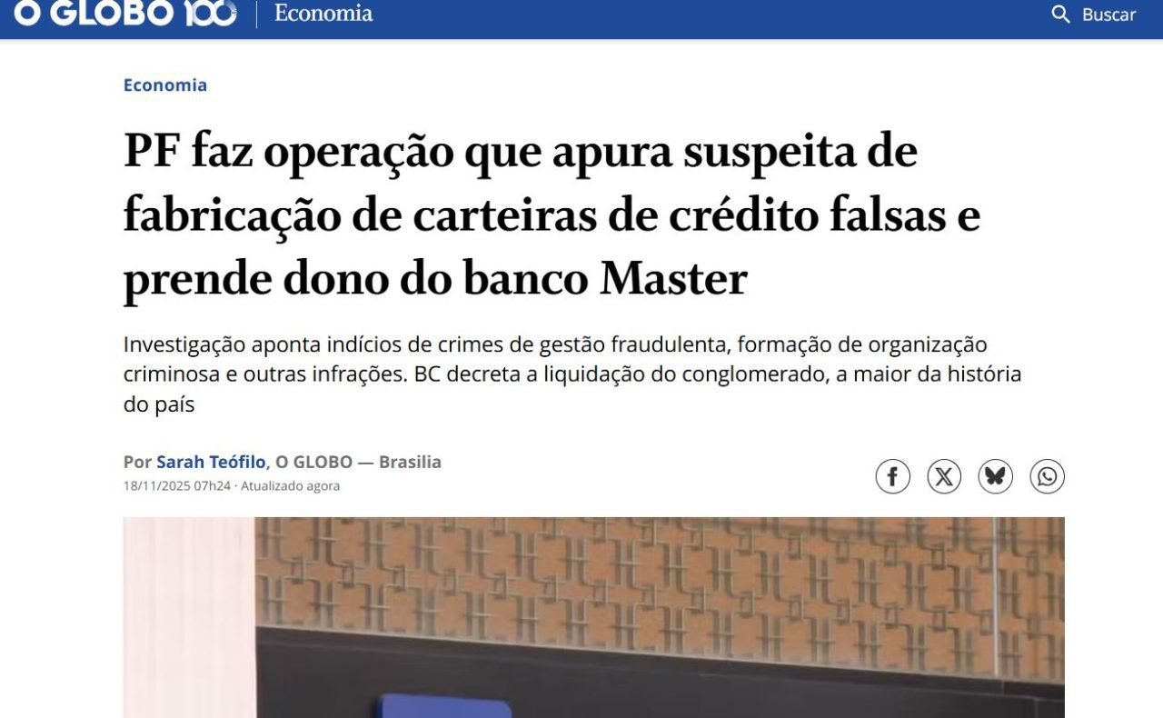 A Operação “Compliance Zero” que a Polícia Federal está realizando desde o início da manhã de hoje (18) para apurar um esquema de negociação de títulos falsos por instituições que integram o Sistema Financeiro Nacional já levou à prisão de dirigentes de instituições como o banqueiro Daniel Vorcaro, dono do Banco Master. Ao mesmo tempo em que a operação policial era realizada, o Banco Central decretou, também pela manhã, a liquidação extrajudicial do Banco Master.