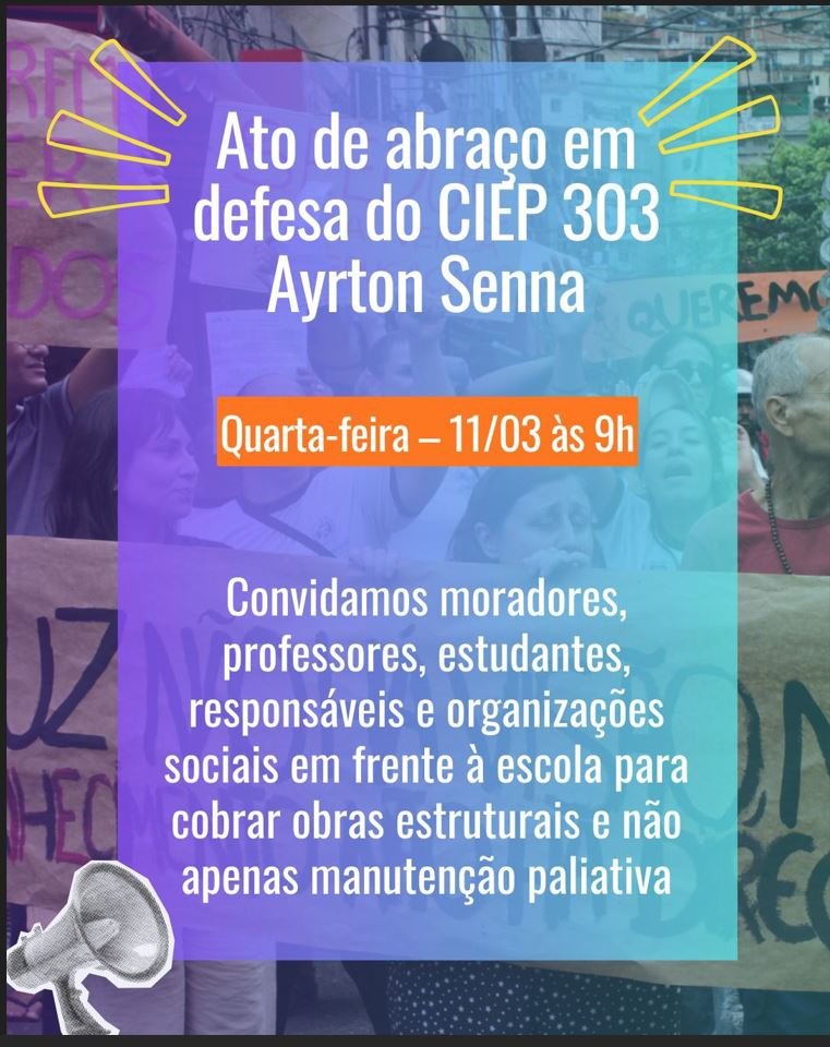 A Regional 1 do Sepe convoca a comunidade escolar do Ciep 303 Ayrton Senna (Rocinha) e membros das organizações sociais que atuam na favela para um novo ato de protesto contra os problemas de infraestrutura na unidade que, desde o início do ano letivo de 2026 vem prejudicando o seu funcionamento. O protesto será realizado na próxima quarta-feira (11), a partir das 9h. Desta vez, a comunidade escolar e representantes dos movimentos sociais da Rocinha estão sendo convidados para dar um abraço em defesa da escola, a única unidade de ensino médio que atende aos jovens da Rocinha.