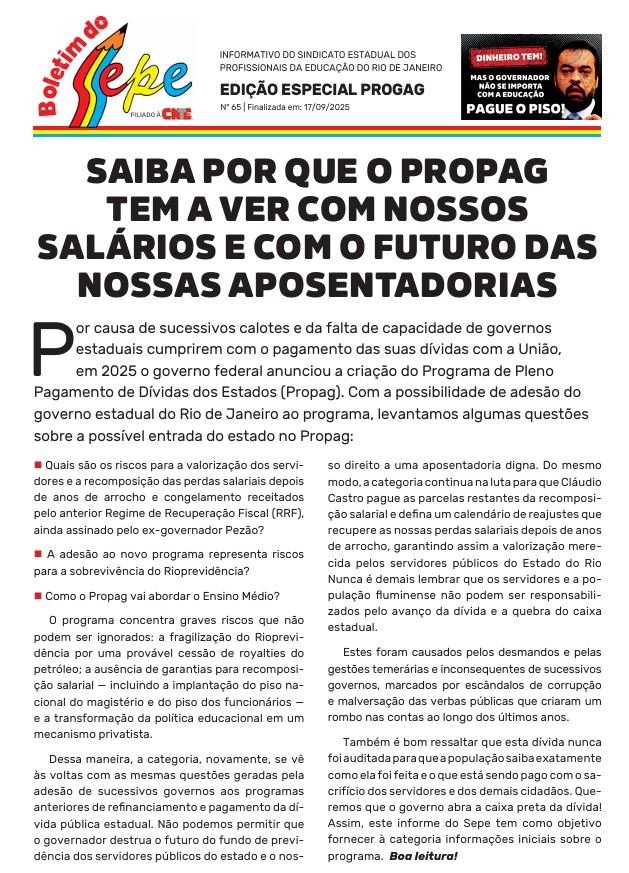 O programa concentra graves riscos que não podem ser ignorados: a fragilização do Rioprevidência por uma provável cessão de royalties do petróleo; a ausência de garantias para recomposição salarial – incluindo a implantação do piso nacional do magistério e do piso dos funcionários – e a transformação da política educacional em um mecanismo privatista.