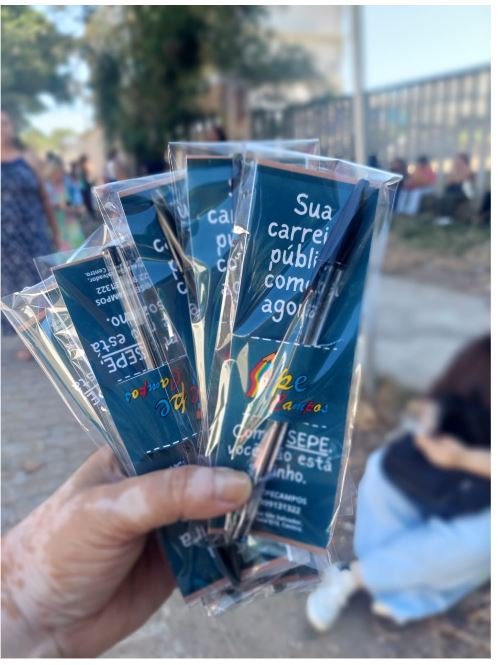 Sepe distribuiu canetas em vários locais de provas para os candidatos ao magistério municipal de Campos ontem (26)