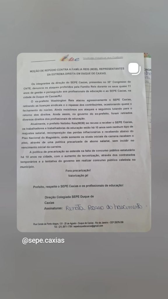 Veja nas imagens os textos das moções de repúdio do núcleo municipal de Japeri e do núcleo municipal de Duque de Caxias entregues no Congresso da CNTE.