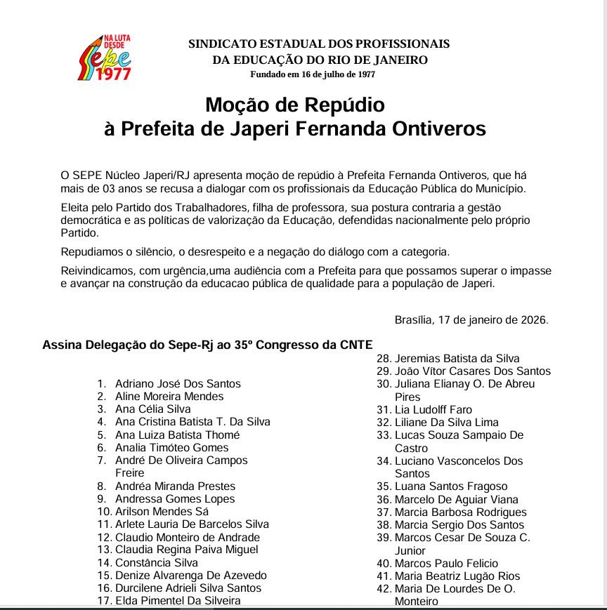 Durante a realização do 35º Congresso da CNTE em Brasília os profissionais de educação das redes públicas do estado do Rio de Janeiro que integraram a delegação do Sepe apresentaram denúncias sobre a situação das redes estadual e municipais de educação. O Sepe Central, Sepe Caxias, Sepe São Gonçalo e Sepe Japeri apresentaram moções de repúdio contra os governos estadual e dos respectivos municípios contra o descaso para com a educação pública, os ataques contra a categoria e seu sindicato e a falta de diálogo.