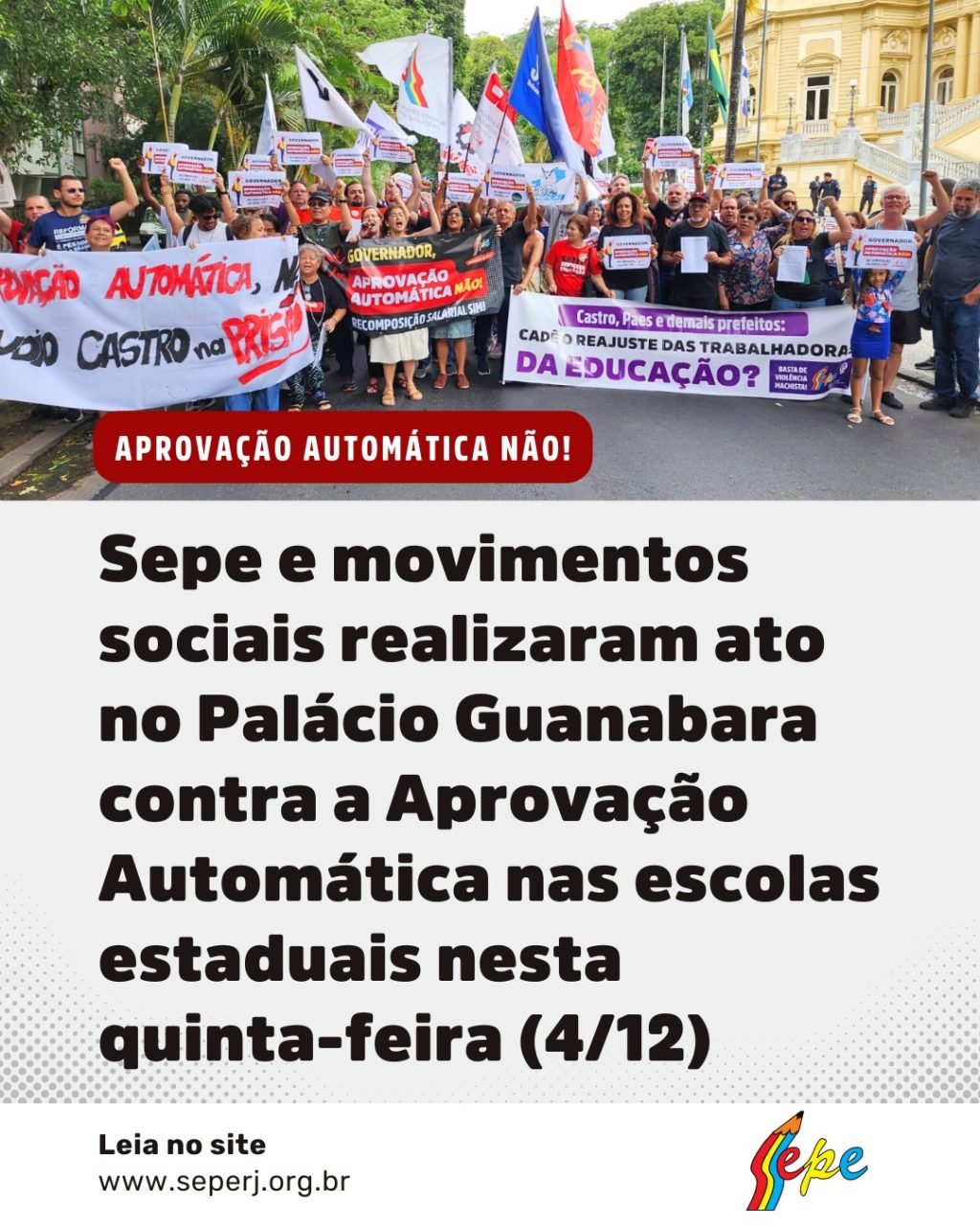 Diversas entidades do movimento sindical e social realizaram um ato público, na tarde desta quinta-feira (04/12), em frente ao Palácio Guanabara, em repúdio ao decreto e resolução do governo do estado do Rio que oficializaram a aprovação automática dos estudantes do ensino médio das escolas estaduais.