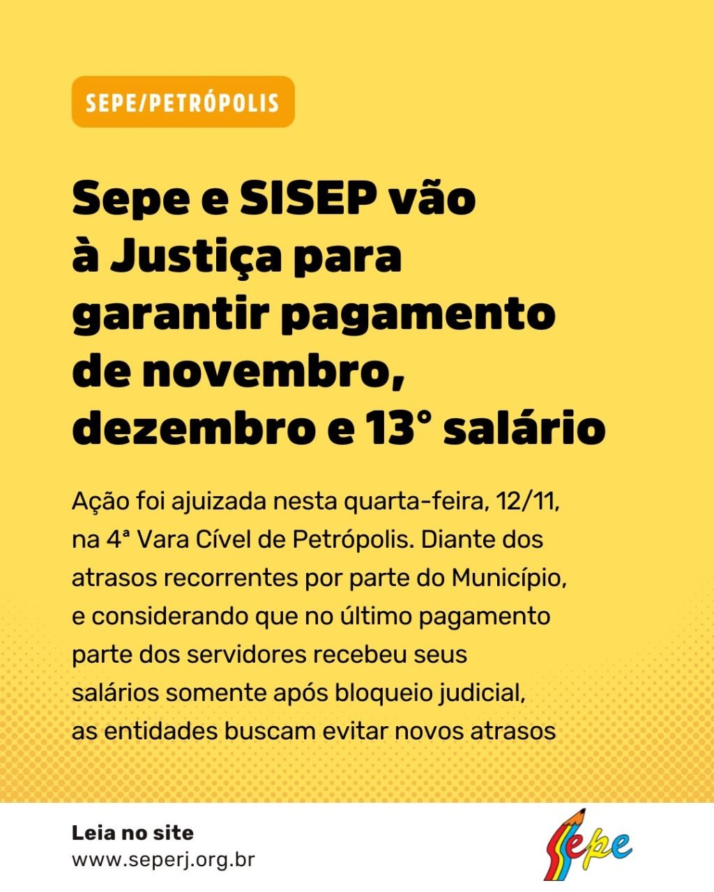 No dia 12 de novembro, o Sepe em conjunto com o SISEP, ajuizou ação na 4ª Vara Cível de Petrópolis para garantir os pagamentos dos servidores públicos referentes aos meses de novembro, dezembro e 13°.