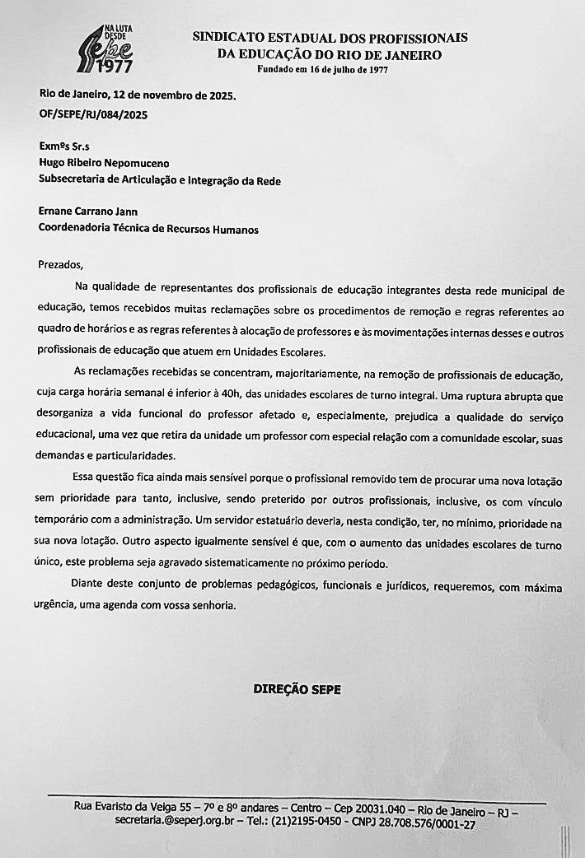Nesta quarta-feira (12/11), a direção do Sepe reuniu-se com a Coordenadoria Técnica de Recursos Humanos da Secretaria Municipal de Educação do Rio de Janeiro (SME-RJ) para discutir as diversas denúncias da categoria sobre remoções indevidas de professores de suas escolas. Durante a audiência, o sindicato, além de abordar os procedimentos de remoção, buscou compreender as regras relativas ao quadro de horários, à alocação de docentes e às movimentações internas desses e de outros profissionais da educação que atuam na SME-RJ.