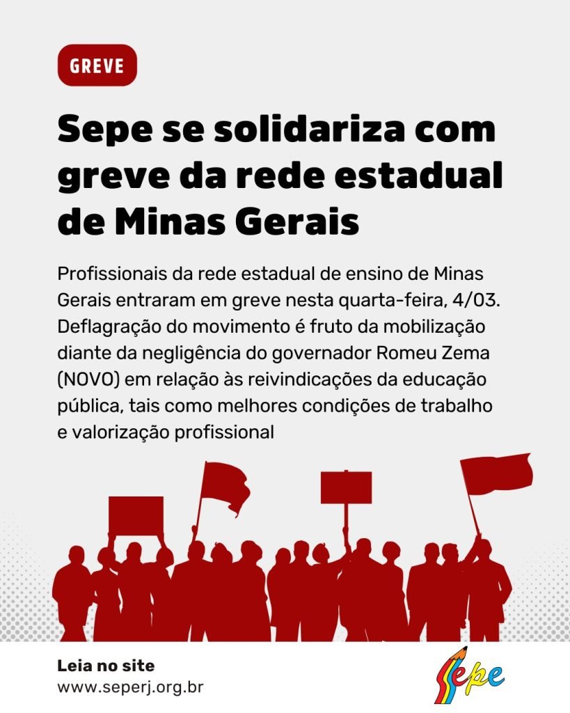 O Sepe se solidariza com os profissionais da rede estadual de ensino de Minas Gerais, que entraram em greve ontem (4). A deflagração do movimento é fruto da mobilização da categoria, diante da negligência do governador Romeu Zema (NOVO) em relação às reivindicações da educação pública, tais como melhores condições de trabalho e valorização profissional.
