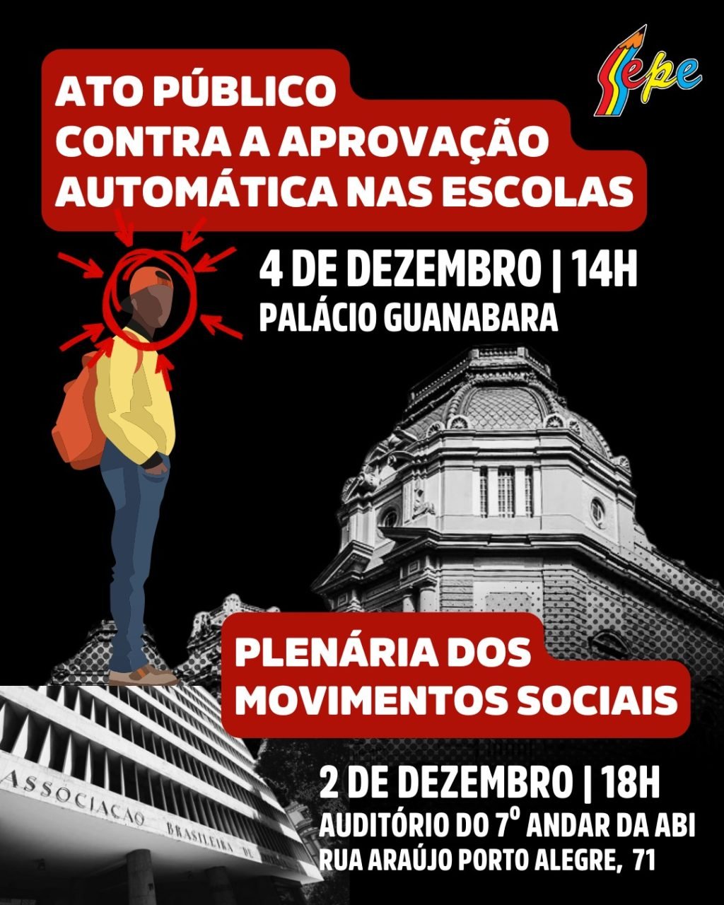 Já na quinta-feira, dia 04/12, às 14h, realizaremos um ato público na frente do Palácio Guanabara para marcar a posição da categoria e denunciar para a população fluminense essa tentativa, com a implementação da aprovação automática, do governador Cláudio Castro e da secretária Roberta Barreto de destruição da escola pública no Rio de Janeiro.