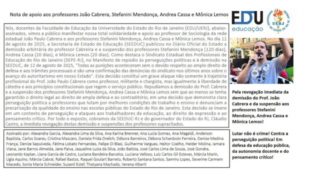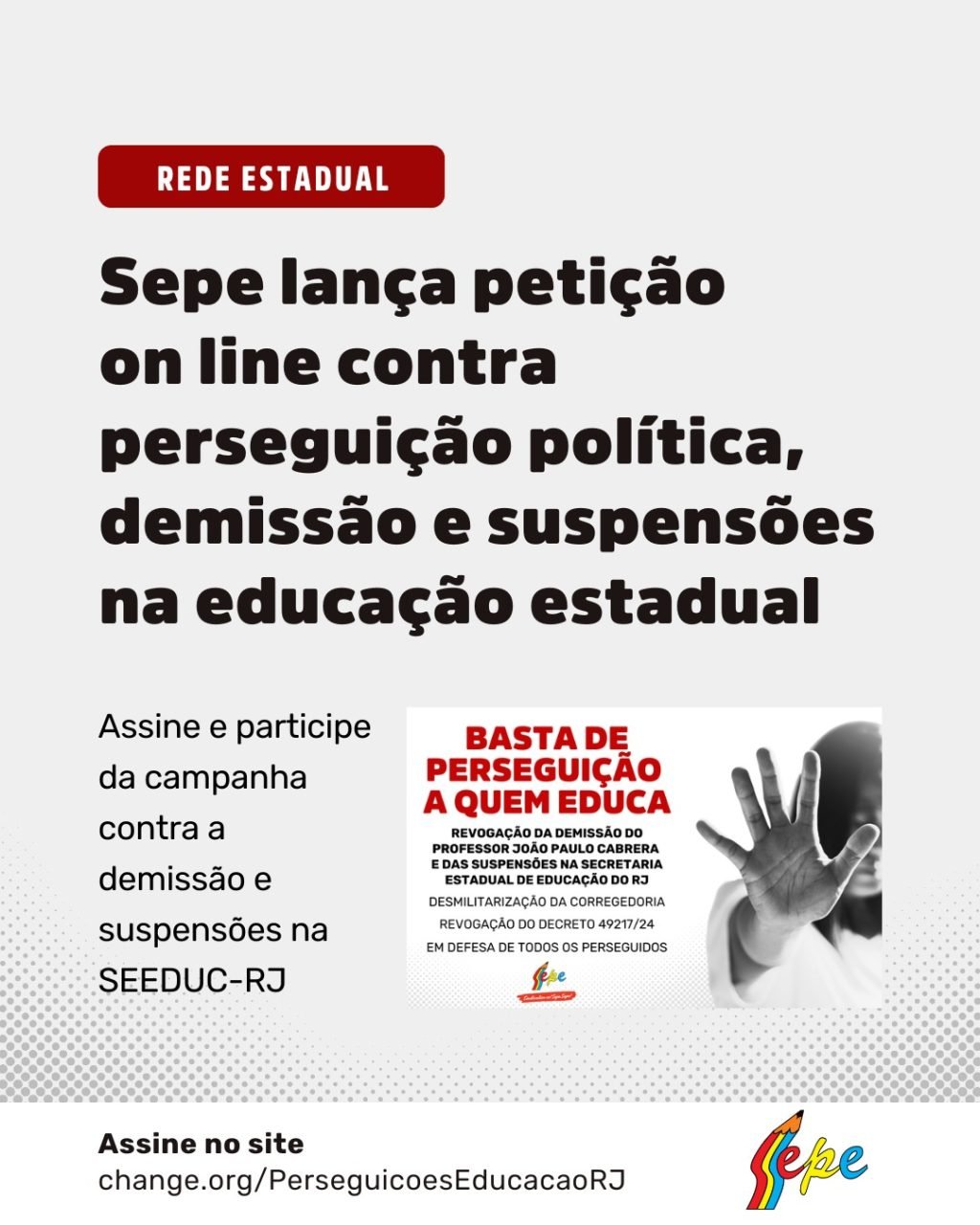 O Sepe acaba de lançar uma petição eletrônica de apoio individual ao professor João Paulo Cabrera e às professoras Andrea Cassa e Mônica Lemos. O primeiro foi demitido e as demais foram suspensas pela Seeduc, vítimas de sindicâncias e processos administrativos disciplinares abertos de forma questionável pelo Estado.
