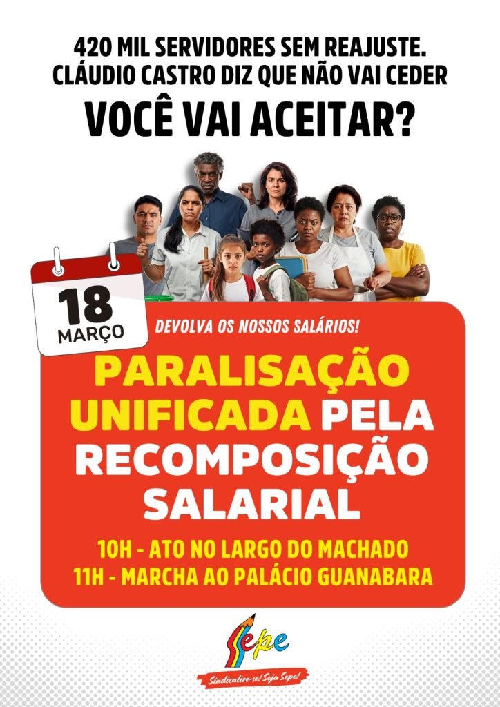 Servidores estaduais do Rio de Janeiro estão unidos contra o calote do governador Cláudio Castro! Na próxima quarta-feira, dia 18 de março, foi convocada uma paralisação geral de todo o funcionalismo público do estado em defesa da recomposição salarial, com ato no Palácio Guanabara – concentração no Largo do Machado, às 10h, e saída em passeata prevista para às 11h.