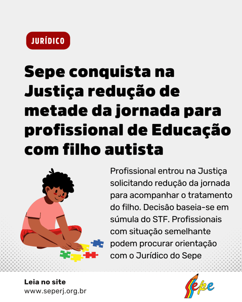 Com base em decisão proferida em fevereiro deste ano pela 10ª Câmara de Direito Público do Tribunal de Justiça do Rio de Janeiro (TJRJ), reconhecendo o direito à redução de carga horária de trabalho para conciliação da mesma com as terapias e consultas médicas necessárias ao desenvolvimento do filho de uma profissional de educação com Transtorno do Espectro Autista (TEA), o Sepe RJ, por meio do seu Departamento Jurídico (DJ), levanta uma questão importante para aqueles(as) profissionais pais ou responsáveis por menores com a mesma condição sobre o direito à jornada de trabalho reduzida, sem diminuição da remuneração, para o acompanhamento do tratamento de seus filhos.